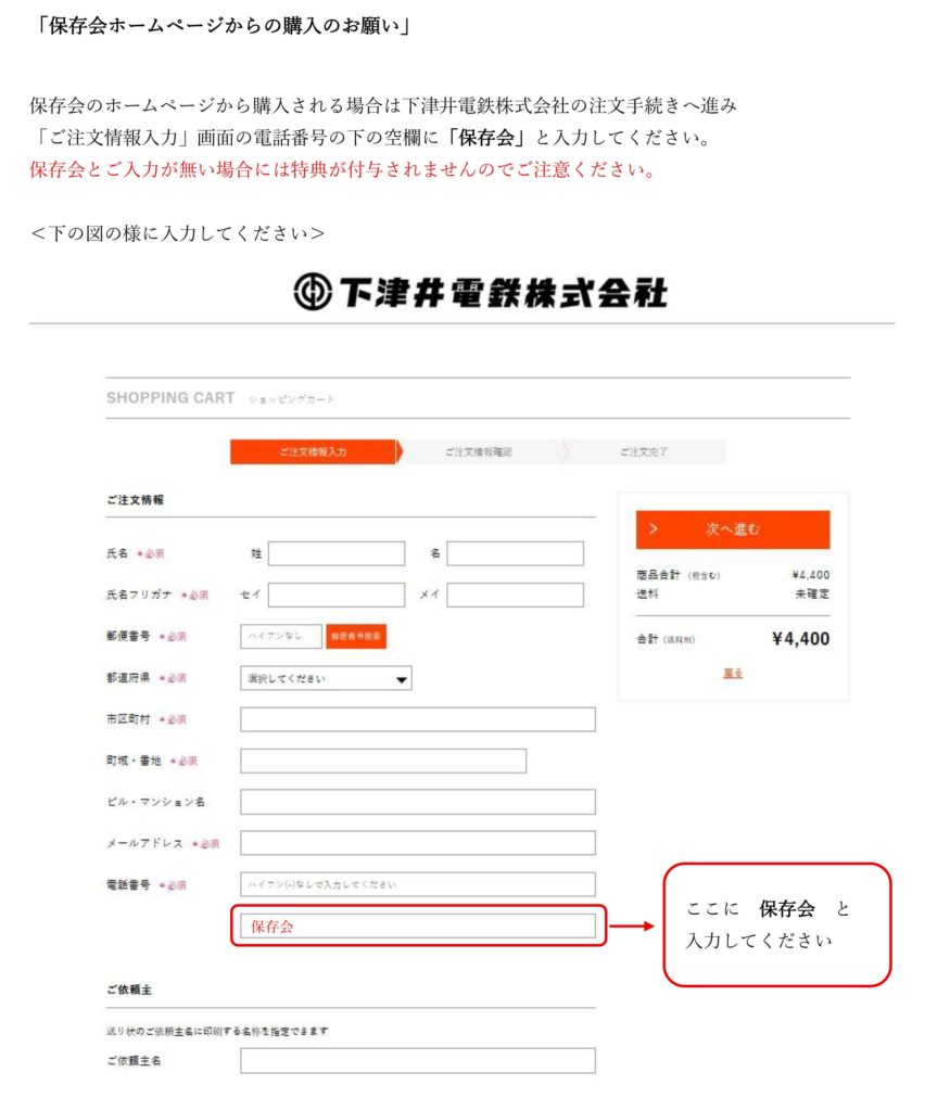 下記リンクの販売サイトからご購入いただく際、記入例のように、所定の欄に「保存会」とご記入ください!